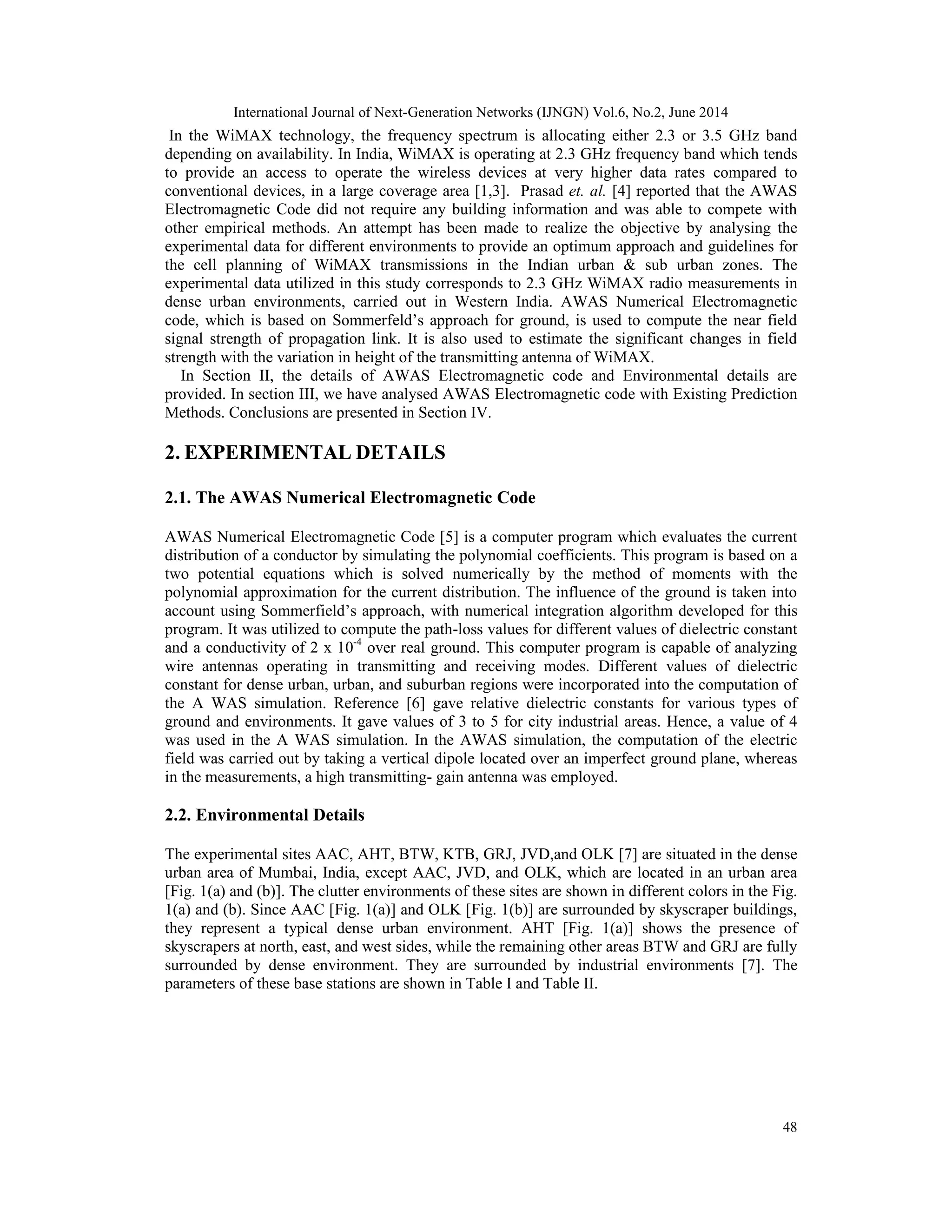 The document presents a numerical analysis of near field distribution at 2300 MHz for WiMAX technology in dense urban environments of western India, utilizing the AWAS electromagnetic code. It highlights the importance of path loss prediction for determining quality service in wireless systems and emphasizes the significant variations in electric field strength due to environmental factors. The findings suggest employing lower transmitting antenna heights and additional repeaters to reduce rapid fluctuations in signal strength, ultimately improving transmission efficiency.