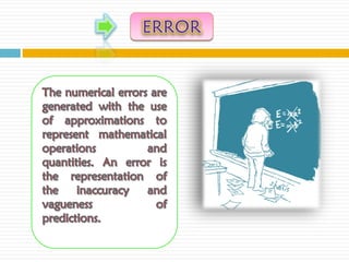 The document discusses numerical approximation and significant figures. It begins by explaining what significant figures are and how they are used to determine the accuracy of measurements. It then provides examples of measurements with different numbers of significant figures. The main points are that numerical methods provide approximate results, and significant figures are used to specify the accuracy of those results in terms of the number of figures that can be reliably used.