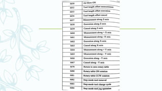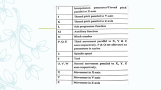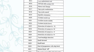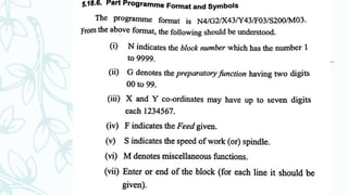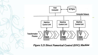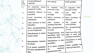 The document provides an overview of numerical control (NC) systems, detailing their types, components, and operational principles, as well as the differences between traditional NC and computer numerical control (CNC) systems. It discusses the advantages and disadvantages of NC machines, various tooling systems, and the programming methods used to control these machines. Additionally, it covers the applications of NC machines in different industries, along with the concepts of part programming and micromachining techniques.