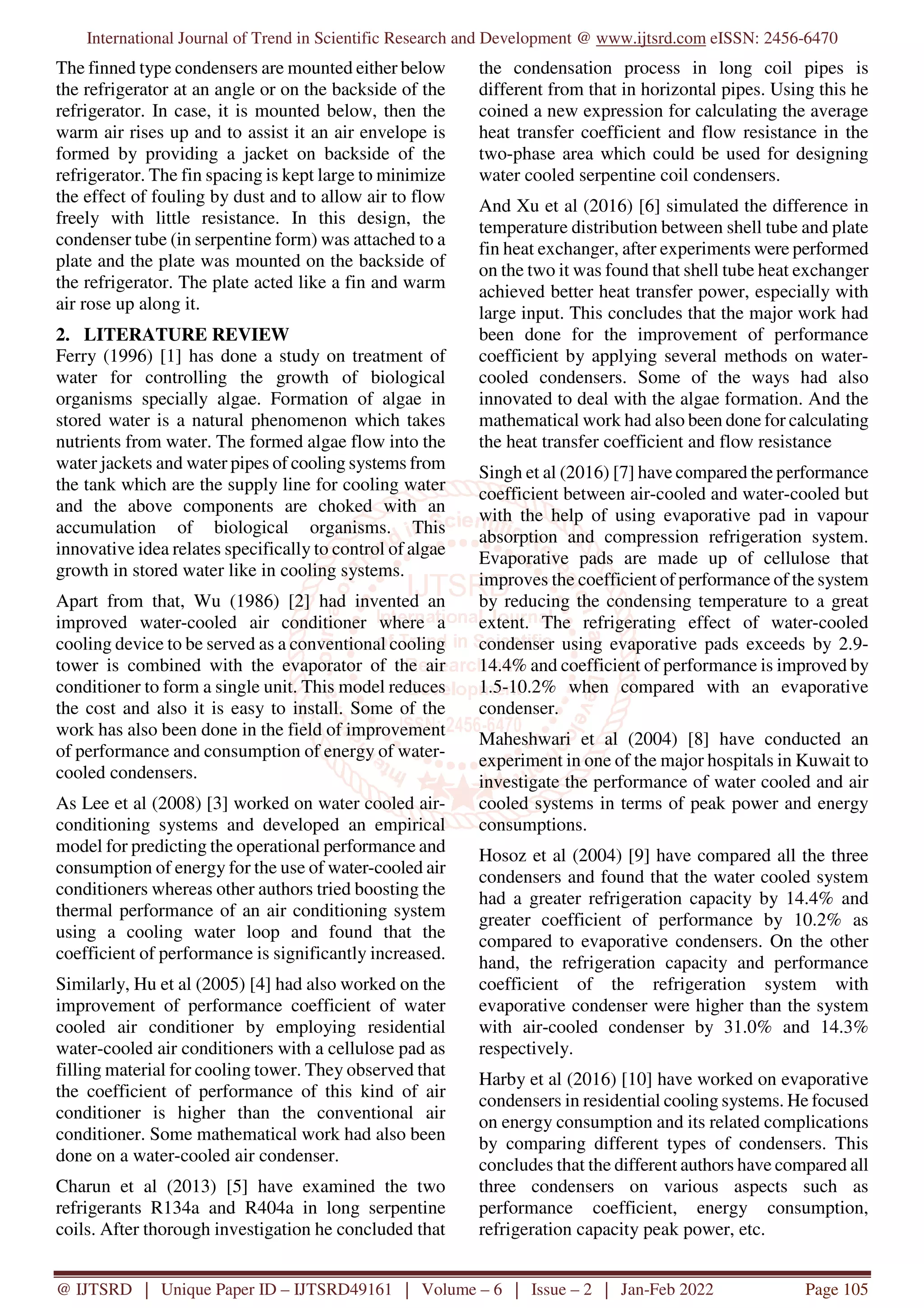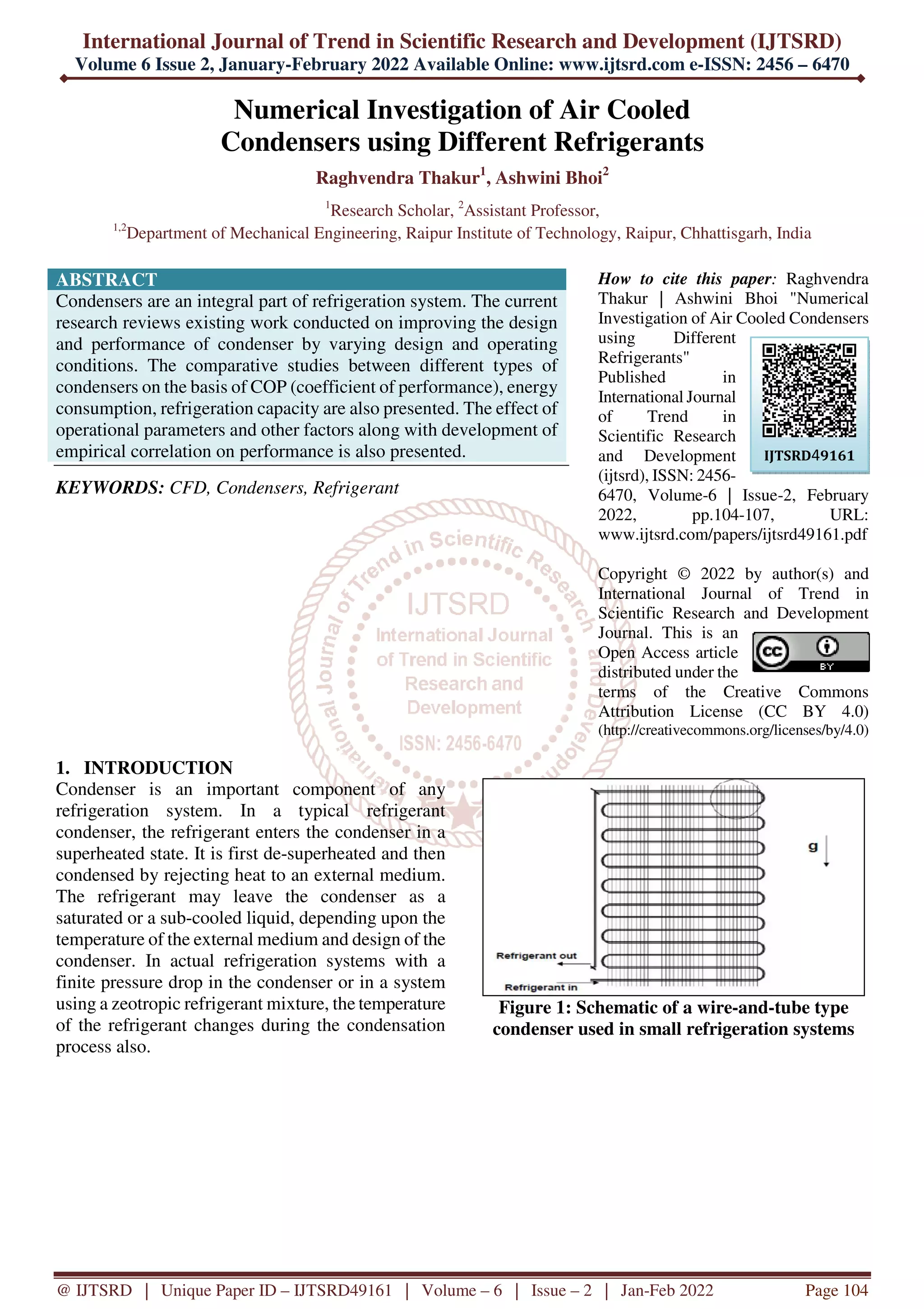 The document presents a numerical investigation into air-cooled condensers using various refrigerants, emphasizing improvements in design and performance factors such as coefficient of performance (COP), energy consumption, and refrigeration capacity. It reviews past research on condenser design and operational optimization, comparing different condenser types and their efficiencies. Findings indicate that water-cooled systems generally achieve higher performance metrics compared to air-cooled systems.