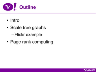 The document discusses numerical linear algebra techniques for analyzing large graphs and networks. It provides examples of large social networks like Flickr that can be represented as graphs and analyzed using graph-based algorithms. Specifically, it discusses using techniques like PageRank to analyze link structures and rank nodes in a graph based on their importance. It also discusses computational methods like power iteration and Krylov subspace methods for efficiently solving the large systems of equations that arise in PageRank and related network analysis problems.