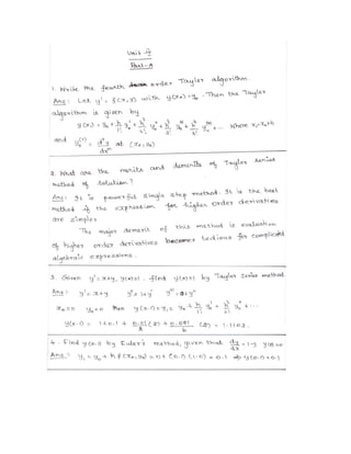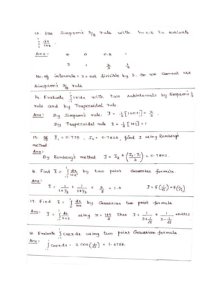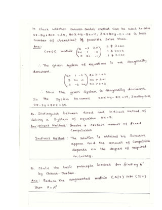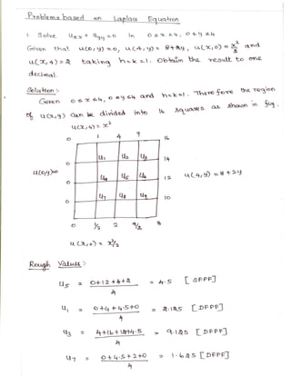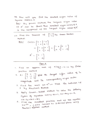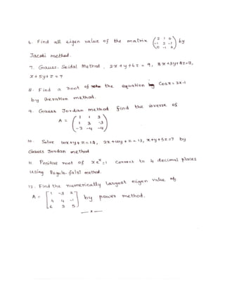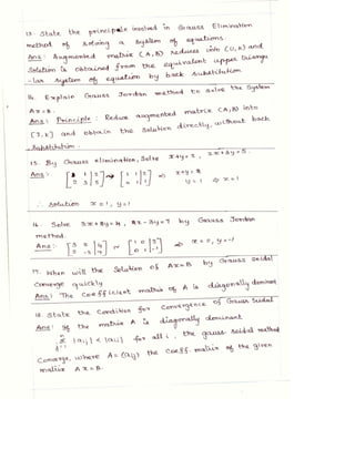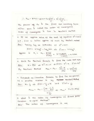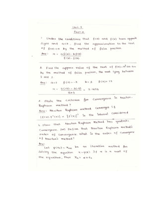 The lecture notes cover numerical methods for solving equations and eigenvalue problems, detailing techniques such as fixed point iteration, Newton's method, and Gaussian elimination. It discusses properties of algebraic and transcendental equations, convergence criteria, and includes examples with detailed calculations. Additionally, the document addresses the method of false position for root finding and presents problems with solutions for practical understanding.
