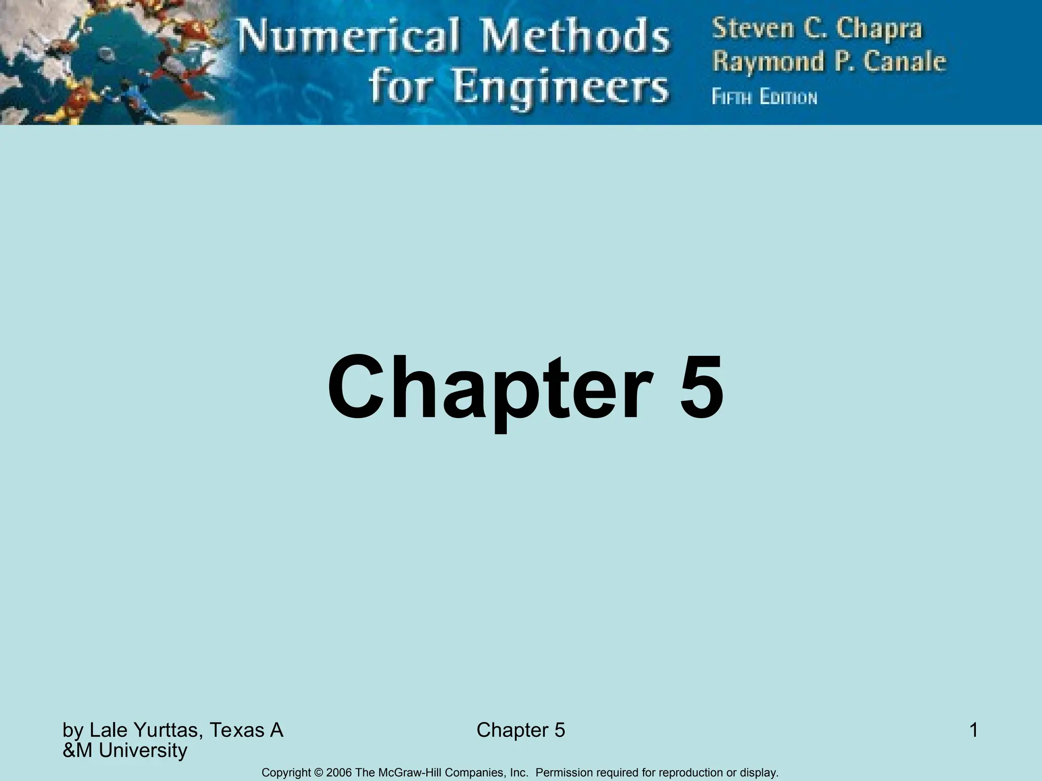 Chapter 5 discusses methods for finding roots of nonlinear equations, focusing on bracketing methods like the bisection and false-position (regula falsi) methods. It outlines the steps to implement these methods, including the necessary conditions for convergence and the evaluation of their pros and cons. The chapter emphasizes the importance of selecting appropriate initial guesses and understanding the behavior of the function to ensure accurate root approximation.