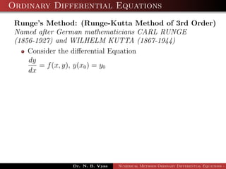 The document discusses numerical methods for solving ordinary differential equations using Runge-Kutta methods of orders 2, 3, and 4. It defines the Runge-Kutta method of order 2, which calculates approximations k1 and k2 to find the solution increment k as their average. It also defines the Runge-Kutta method of order 3, which calculates approximations k1, k2, k3 to find the solution increment k as a weighted average. Finally, it defines the Runge-Kutta method of order 4, which calculates approximations k1, k2, k3, k4 to find the solution increment k as a weighted average.