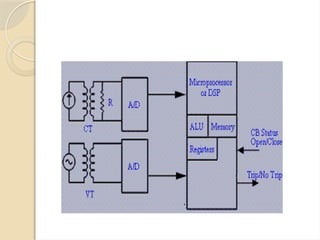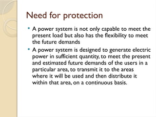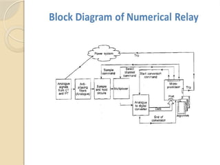 The document discusses the necessity of numerical relays in power systems for protection against faults to maintain continuity of supply, minimize damage, and ensure personnel safety. It outlines different types of electrical faults, their causes, consequences, and the fundamental requirements of effective protection mechanisms. Additionally, it describes the evolution of numerical relays as advanced protective devices that integrate multiple functions, offering advantages such as self-monitoring and high-speed communication.