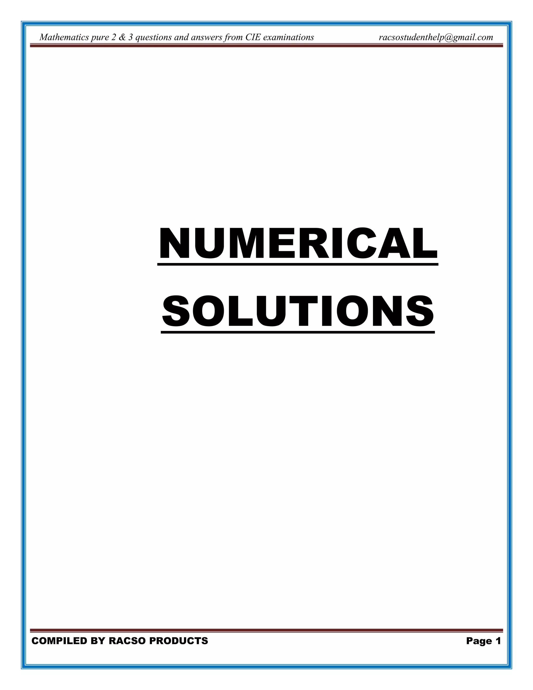 This document is a compilation of 19 pages of Mathematics pure 2 & 3 questions and answers from CIE examinations that were compiled by Racso Products. It provides sample questions, solutions, and numerical answers to help students prepare for the CIE Mathematics pure 2 & 3 examinations. Contact information is provided to obtain additional help.