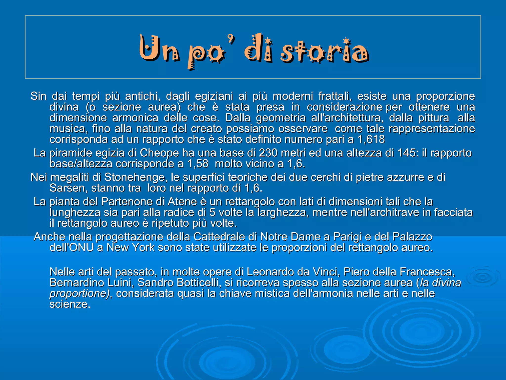 Il documento esplora il concetto del numero aureo (φ) e la sezione aurea, evidenziando la loro presenza storica nelle arti, nell'architettura e persino nelle proporzioni del corpo umano. Viene dimostrato come queste proporzioni siano state utilizzate dai greci, dai pitagorici e da artisti come Leonardo da Vinci per creare armonia visiva e simmetria. La relazione tra la sequenza di Fibonacci e il numero aureo è anche discussa, mostrando come queste proporzioni emergano in natura e nel design umano.