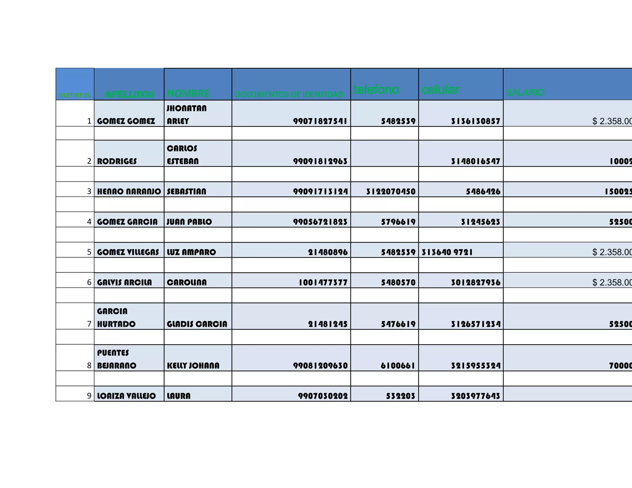 numeros APELLIDOS NOMBREDOCUMENTOS DE IDENTIDAD telefono celular SALARIO