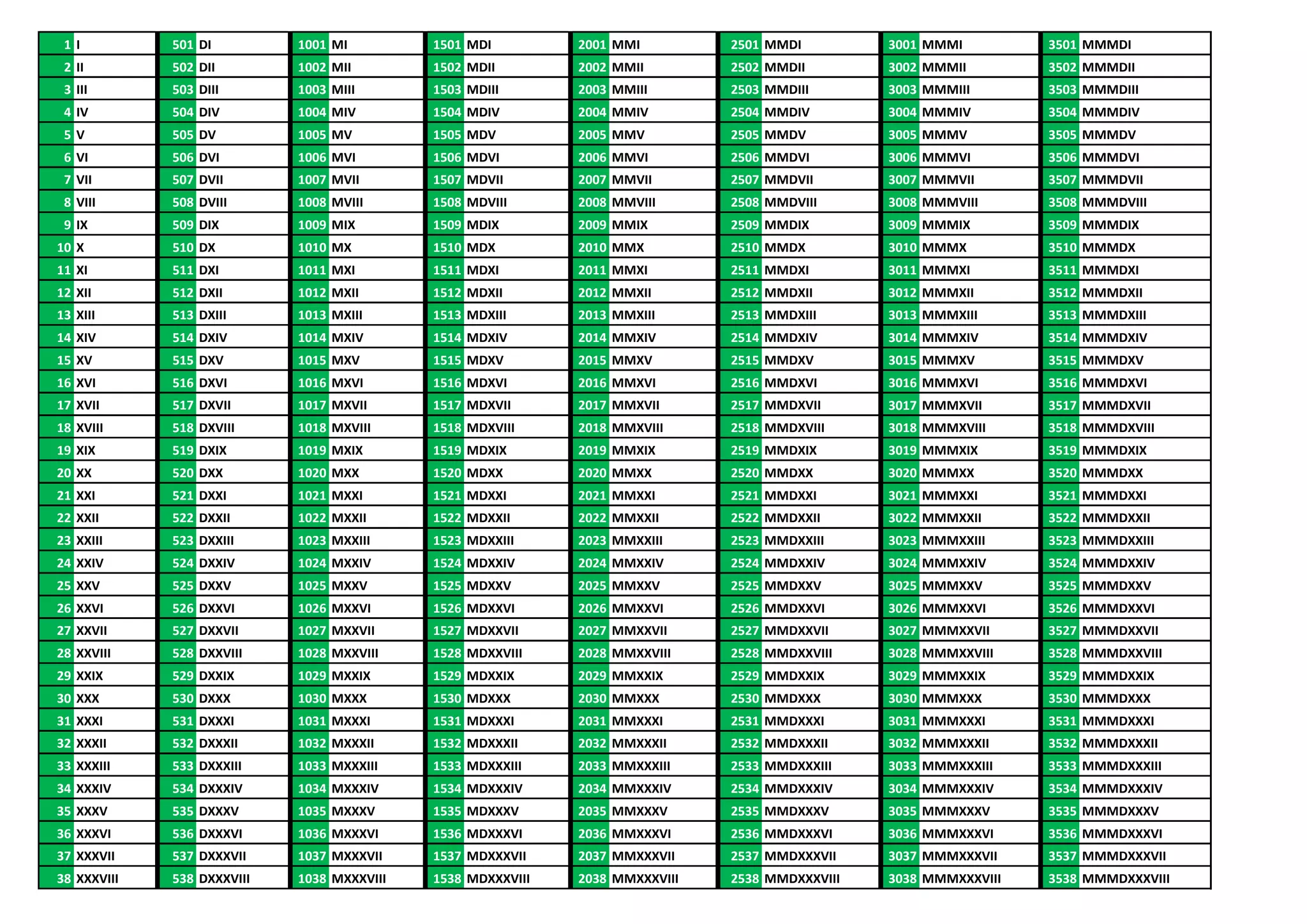 501 DI 1001 MI 1501 MDI 2001 MMI 2501 MMDI 3001 MMMI 3501 MMMDI 2 II 502 DII 1002 MII 1502 MDII 2002 MMII 2502 MMDII 3002 MMMII 3502 MMMDII 3 III 503 DIII 1003 MIII 1503 MDIII 2003 MMIII 2503 MMDIII 3003 MMMIII 3503 MMMDIII 4 IV 504 DIV 1004 MIV 1504 MDIV 2004 MMIV 2504 MMDIV 3004 MMMIV 3504 MMMDIV 5V 505 DV 1005 MV 1505 MDV 2005 MMV 2505 MMDV 3005 MMMV 3505 MMMDV 6 VI 506 DVI 1006 MVI 1506 MDVI 2006 MMVI 2506 MMDVI 3006 MMMVI 3506 MMMDVI 7 VII 507 DVII 1007 MVII 1507 MDVII 2007 MMVII 2507 MMDVII 3007 MMMVII 3507 MMMDVII 8 VIII 508 DVIII 1008 MVIII 1508 MDVIII 2008 MMVIII 2508 MMDVIII 3008 MMMVIII 3508 MMMDVIII 9 IX 509 DIX 1009 MIX 1509 MDIX 2009 MMIX 2509 MMDIX 3009 MMMIX 3509 MMMDIX 10 X 510 DX 1010 MX 1510 MDX 2010 MMX 2510 MMDX 3010 MMMX 3510 MMMDX 11 XI 511 DXI 1011 MXI 1511 MDXI 2011 MMXI 2511 MMDXI 3011 MMMXI 3511 MMMDXI 12 XII 512 DXII 1012 MXII 1512 MDXII 2012 MMXII 2512 MMDXII 3012 MMMXII 3512 MMMDXII 13 XIII 513 DXIII 1013 MXIII 1513 MDXIII 2013 MMXIII 2513 MMDXIII 3013 MMMXIII 3513 MMMDXIII 14 XIV 514 DXIV 1014 MXIV 1514 MDXIV 2014 MMXIV 2514 MMDXIV 3014 MMMXIV 3514 MMMDXIV 15 XV 515 DXV 1015 MXV 1515 MDXV 2015 MMXV 2515 MMDXV 3015 MMMXV 3515 MMMDXV 16 XVI 516 DXVI 1016 MXVI 1516 MDXVI 2016 MMXVI 2516 MMDXVI 3016 MMMXVI 3516 MMMDXVI 17 XVII 517 DXVII 1017 MXVII 1517 MDXVII 2017 MMXVII 2517 MMDXVII 3017 MMMXVII 3517 MMMDXVII 18 XVIII 518 DXVIII 1018 MXVIII 1518 MDXVIII 2018 MMXVIII 2518 MMDXVIII 3018 MMMXVIII 3518 MMMDXVIII 19 XIX 519 DXIX 1019 MXIX 1519 MDXIX 2019 MMXIX 2519 MMDXIX 3019 MMMXIX 3519 MMMDXIX 20 XX 520 DXX 1020 MXX 1520 MDXX 2020 MMXX 2520 MMDXX 3020 MMMXX 3520 MMMDXX 21 XXI 521 DXXI 1021 MXXI 1521 MDXXI 2021 MMXXI 2521 MMDXXI 3021 MMMXXI 3521 MMMDXXI 22 XXII 522 DXXII 1022 MXXII 1522 MDXXII 2022 MMXXII 2522 MMDXXII 3022 MMMXXII 3522 MMMDXXII 23 XXIII 523 DXXIII 1023 MXXIII 1523 MDXXIII 2023 MMXXIII 2523 MMDXXIII 3023 MMMXXIII 3523 MMMDXXIII 24 XXIV 524 DXXIV 1024 MXXIV 1524 MDXXIV 2024 MMXXIV 2524 MMDXXIV 3024 MMMXXIV 3524 MMMDXXIV 25 XXV 525 DXXV 1025 MXXV 1525 MDXXV 2025 MMXXV 2525 MMDXXV 3025 MMMXXV 3525 MMMDXXV 26 XXVI 526 DXXVI 1026 MXXVI 1526 MDXXVI 2026 MMXXVI 2526 MMDXXVI 3026 MMMXXVI 3526 MMMDXXVI 27 XXVII 527 DXXVII 1027 MXXVII 1527 MDXXVII 2027 MMXXVII 2527 MMDXXVII 3027 MMMXXVII 3527 MMMDXXVII 28 XXVIII 528 DXXVIII 1028 MXXVIII 1528 MDXXVIII 2028 MMXXVIII 2528 MMDXXVIII 3028 MMMXXVIII 3528 MMMDXXVIII 29 XXIX 529 DXXIX 1029 MXXIX 1529 MDXXIX 2029 MMXXIX 2529 MMDXXIX 3029 MMMXXIX 3529 MMMDXXIX 30 XXX 530 DXXX 1030 MXXX 1530 MDXXX 2030 MMXXX 2530 MMDXXX 3030 MMMXXX 3530 MMMDXXX 31 XXXI 531 DXXXI 1031 MXXXI 1531 MDXXXI 2031 MMXXXI 2531 MMDXXXI 3031 MMMXXXI 3531 MMMDXXXI 32 XXXII 532 DXXXII 1032 MXXXII 1532 MDXXXII 2032 MMXXXII 2532 MMDXXXII 3032 MMMXXXII 3532 MMMDXXXII 33 XXXIII 533 DXXXIII 1033 MXXXIII 1533 MDXXXIII 2033 MMXXXIII 2533 MMDXXXIII 3033 MMMXXXIII 3533 MMMDXXXIII 34 XXXIV 534 DXXXIV 1034 MXXXIV 1534 MDXXXIV 2034 MMXXXIV 2534 MMDXXXIV 3034 MMMXXXIV 3534 MMMDXXXIV 35 XXXV 535 DXXXV 1035 MXXXV 1535 MDXXXV 2035 MMXXXV 2535 MMDXXXV 3035 MMMXXXV 3535 MMMDXXXV 36 XXXVI 536 DXXXVI 1036 MXXXVI 1536 MDXXXVI 2036 MMXXXVI 2536 MMDXXXVI 3036 MMMXXXVI 3536 MMMDXXXVI 37 XXXVII 537 DXXXVII 1037 MXXXVII 1537 MDXXXVII 2037 MMXXXVII 2537 MMDXXXVII 3037 MMMXXXVII 3537 MMMDXXXVII 38 XXXVIII 538 DXXXVIII 1038 MXXXVIII 1538 MDXXXVIII 2038 MMXXXVIII 2538 MMDXXXVIII 3038 MMMXXXVIII 3538 MMMDXXXVIII