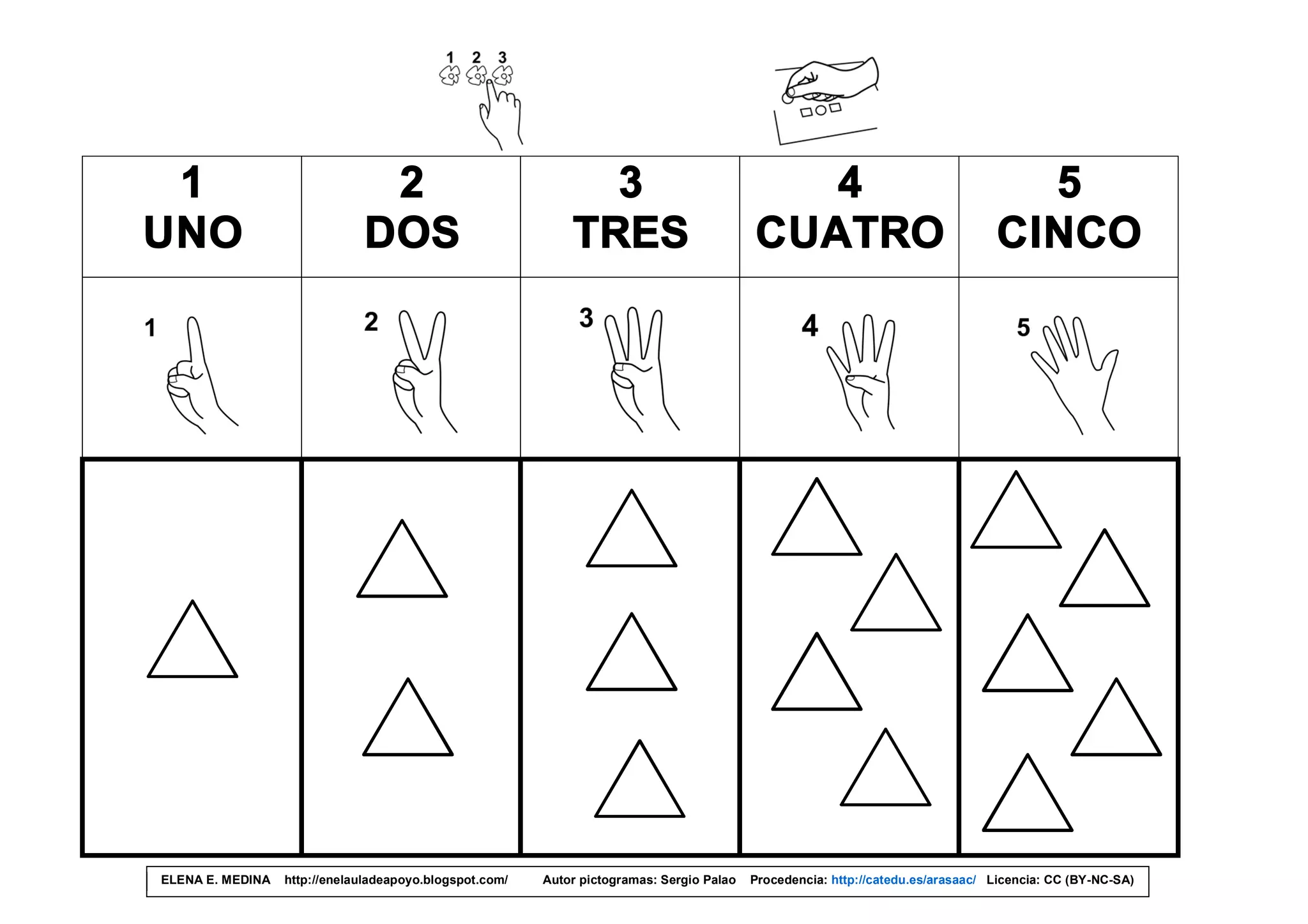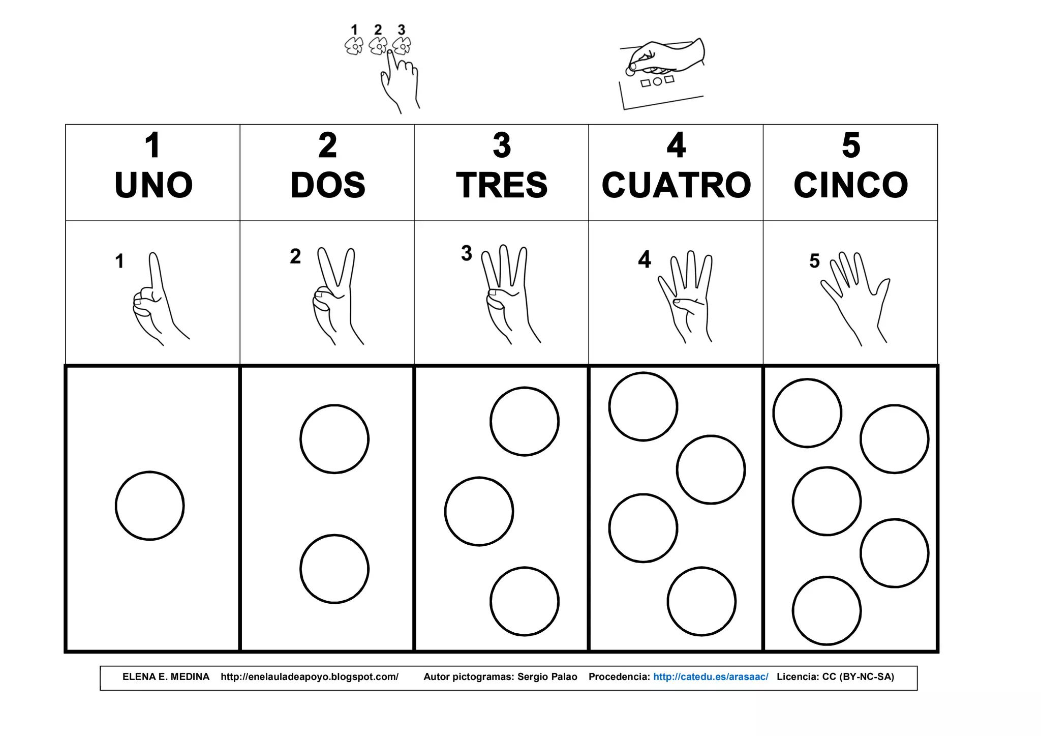 El documento enumera los números del 1 al 5 en repetidas ocasiones y proporciona información de crédito sobre el autor y origen de los pictogramas.