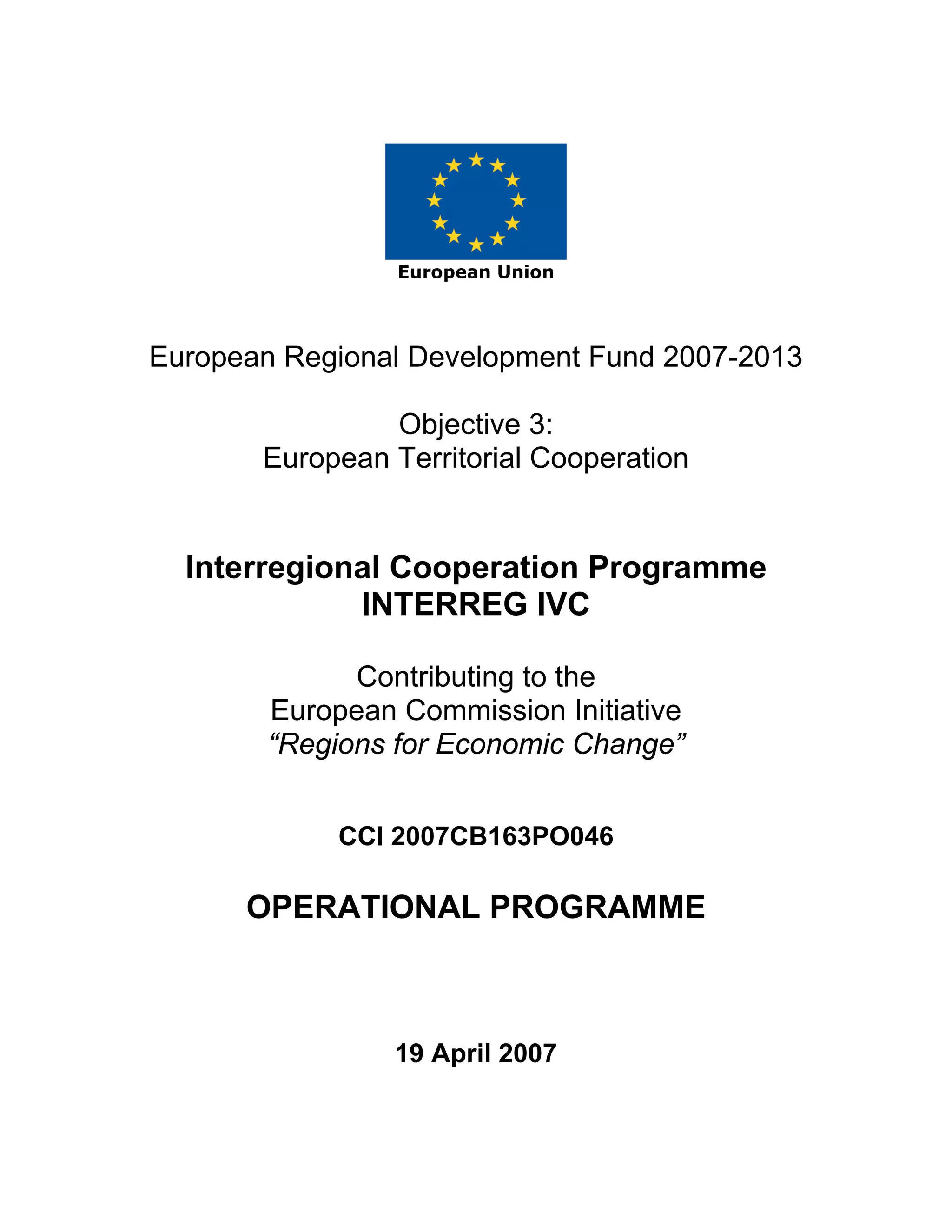 This document outlines the operational programme for the Interregional Cooperation Programme 2007-2013. It discusses the context for interregional cooperation, including developments in the global, territorial, and policy contexts. Specifically, it notes the challenges of globalization, climate change, and EU enlargement. It also discusses how the renewed Lisbon and Gothenburg strategies and EU cohesion policy for 2007-2013 emphasize innovation, knowledge economy, environment, and risk prevention. The operational programme is designed to support interregional cooperation projects addressing these priorities.