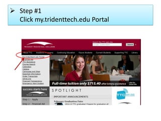 The document outlines 18 steps to register for courses at Trident Technical College, including logging into the student portal, searching for courses by term and subject, selecting preferred courses and sections, submitting course selections, registering for selected courses, checking registration status, reviewing and printing schedules, and being reminded to pay tuition by deadlines to avoid being purged.