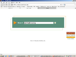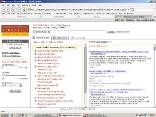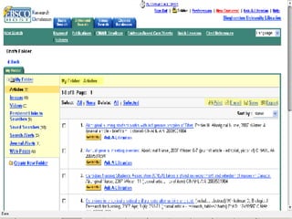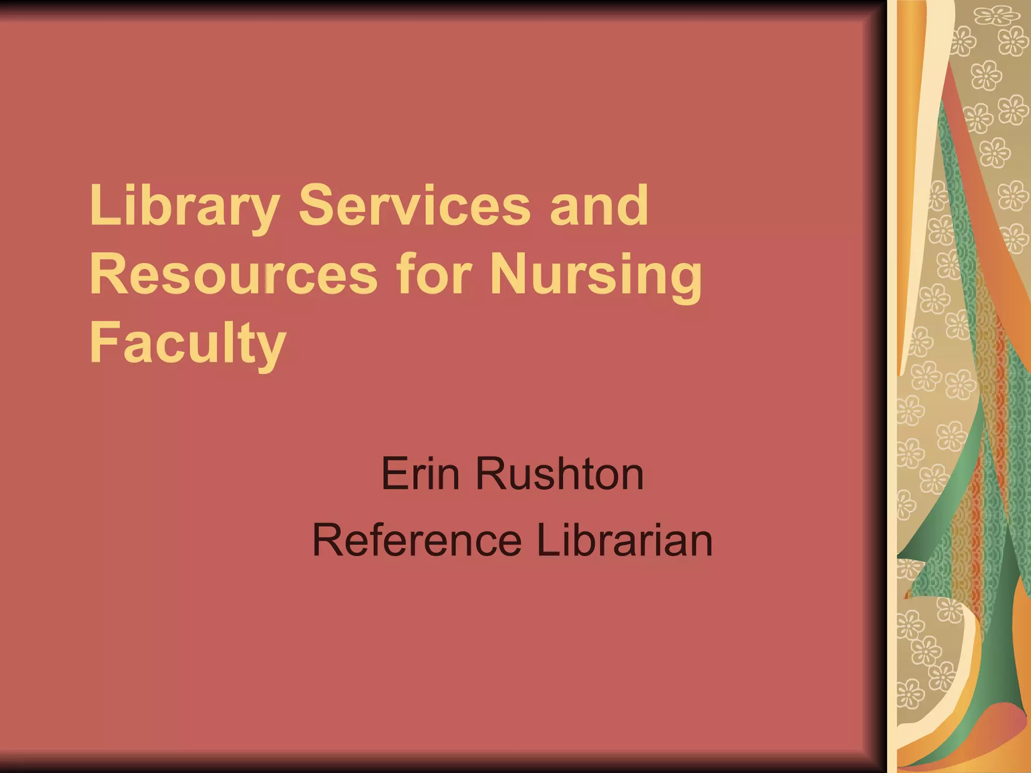 The document provides an overview of library services and resources available to nursing faculty at Binghamton University. It describes services such as borrowing privileges, off-campus access to electronic resources, interlibrary loans, reserves and e-reserves, and instructional services. It also outlines key databases for nursing research, including CINAHL, Cochrane Library, and Health Reference Centre. Librarians are available for instruction sessions, library assignments, and purchase recommendations.