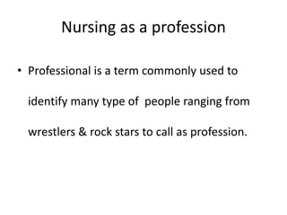Nursing is considered a profession based on specialized education and training aimed at providing skilled service with ethical components to others. It involves mastery of theoretical knowledge, problem-solving abilities, and use of knowledge in practice. Professional nursing values include commitment to serving patients with dignity, autonomy, and accountability. Nurses have independent functions like observation, documentation, and education, as well as dependent functions carrying out physician orders. Ethics are a key part of the profession focusing on principles like autonomy, beneficence, and confidentiality.