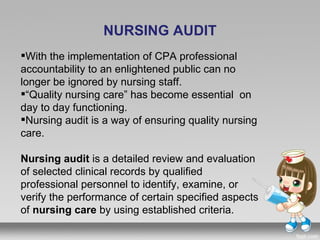 The document discusses nursing audits as a crucial mechanism for ensuring quality nursing care, detailing their history, purposes, types, and methodologies. It highlights the evolution from early clinical audits by figures like Florence Nightingale to contemporary nursing audit practices, emphasizing evaluation methods such as internal, external, retrospective, concurrent, and peer reviews. Overall, it underscores the importance of structured processes and criteria in conducting effective audits to improve nursing standards and patient care.