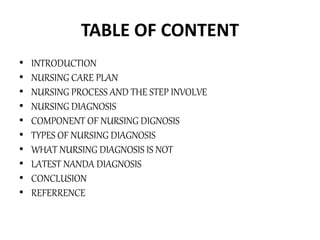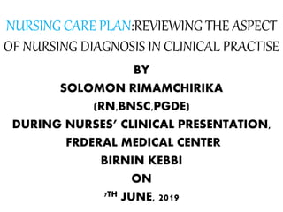The document outlines the importance of nursing diagnosis and care plans in clinical practice, emphasizing the nursing process as a framework for effective patient care. It details the steps involved in creating individualized nursing care plans based on patient assessments, the components of nursing diagnosis, and the types of nursing diagnoses recognized by the North American Nursing Diagnosis Association (NANDA). Additionally, it discusses challenges faced in implementing nursing care plans in Nigeria and concludes that effective nursing care relies on accurate diagnoses and the development of coherent care plans.
