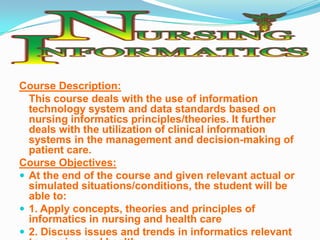 This document discusses the course Nursing Informatics. The course covers the use of information technology and data standards in nursing based on informatics principles. It deals with using clinical information systems to manage patient care and support decision making. The course objectives are to apply informatics concepts to nursing and discuss relevant issues and trends. Various topics are outlined including computers and nursing history, computer systems, issues in informatics, informatics theories, and applying informatics in different nursing practices and internationally. Students are expected to create an online nursing informatics page and do an individual or group presentation to pass the course.