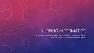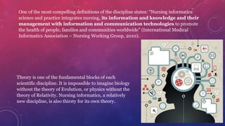 Nursing informatics integrates nursing, computer science, and information science. It aims to promote health through information and communication technologies. Theory is important for nursing informatics as an emerging discipline. Kurt Lewin's change theory and diffusion of innovation theory can be applied to nursing informatics. Lewin's theory involves three stages - unfreezing, changing, and refreezing. Diffusion of innovation theory explains how innovations spread through populations over time. Both theories can help understand and guide changes in nursing informatics.
