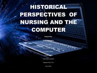 This document provides a historical perspective on nursing and computers from the 1960s to present. It discusses how computers initially emerged in nursing to support basic business functions but later became integral tools for nursing practice, administration, education, and research. Key developments included the introduction of electronic health records, nursing terminology standards, and greater integration of computers into all areas of nursing by the 1990s. Landmark events that advanced the use of computers in nursing are also noted from the early 1970s.