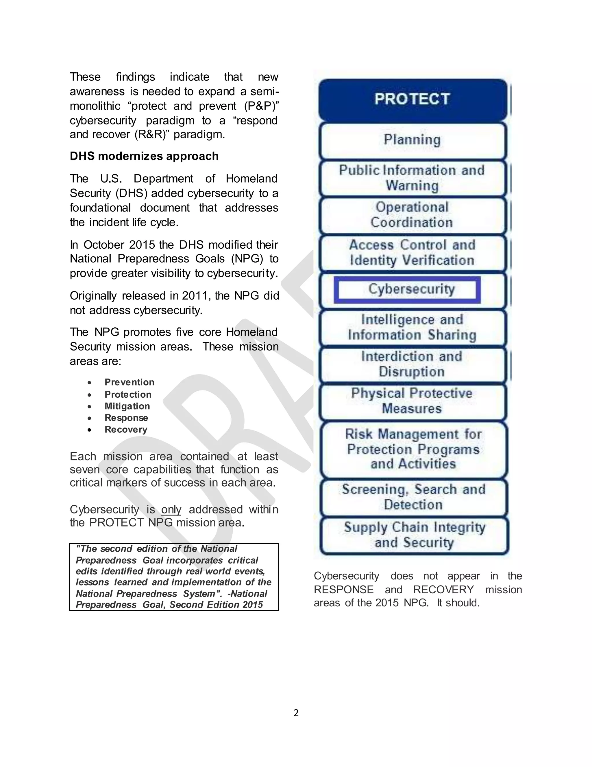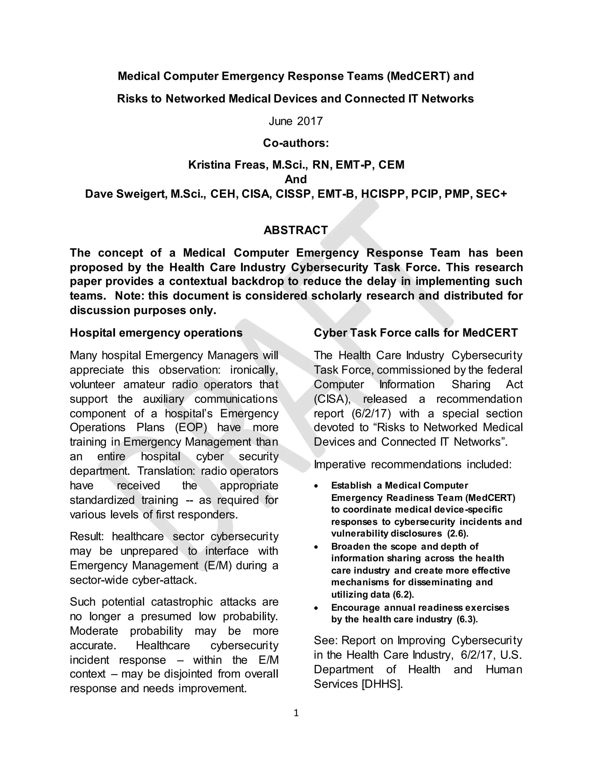 The document discusses establishing Medical Computer Emergency Response Teams (MedCERT) to coordinate responses to cybersecurity incidents affecting medical devices and networks. It argues that healthcare cybersecurity is currently unprepared for emergencies and that response and recovery need to be emphasized in addition to prevention and protection. The document recommends that MedCERT teams receive training in the National Incident Management System and Incident Command System to effectively respond to incidents. It also calls for improved information sharing across the healthcare industry regarding cyber threats.