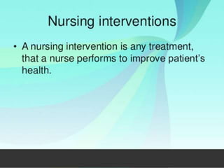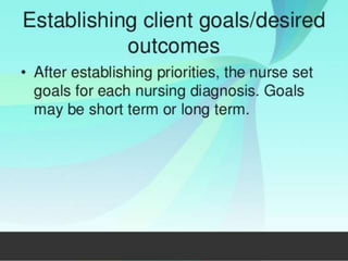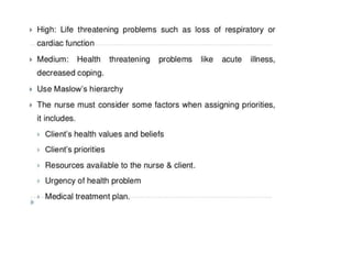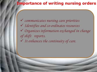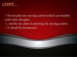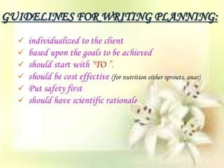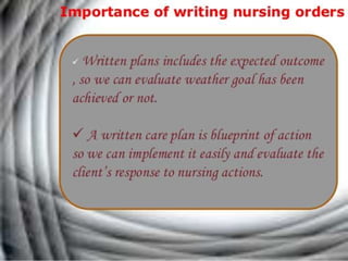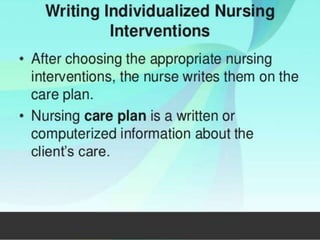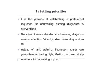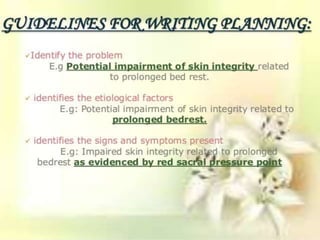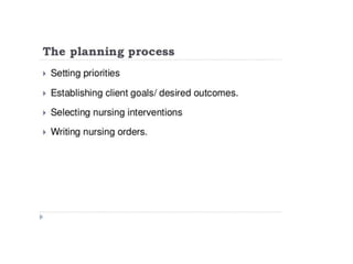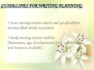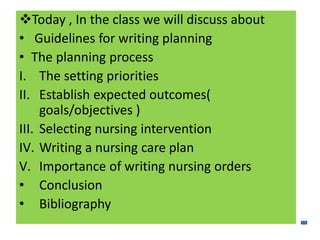 The document discusses the nursing process planning phase presented by Ms. Mohini. It covers guidelines for writing a nursing plan, including setting priorities, establishing expected outcomes and goals, selecting nursing interventions, writing a nursing care plan, and the importance of writing nursing orders. The presentation concludes with a discussion of these topics and a bibliography citing relevant sources.