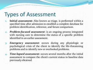 This document discusses the process of nursing assessment which includes physiological, psychological, social, and lifestyle factors. It describes the techniques used in physical assessment: inspection, palpation, percussion, and auscultation. It also discusses establishing nursing diagnoses, developing a care plan with goals, implementing care, documenting care, and evaluating the effectiveness of the care plan.