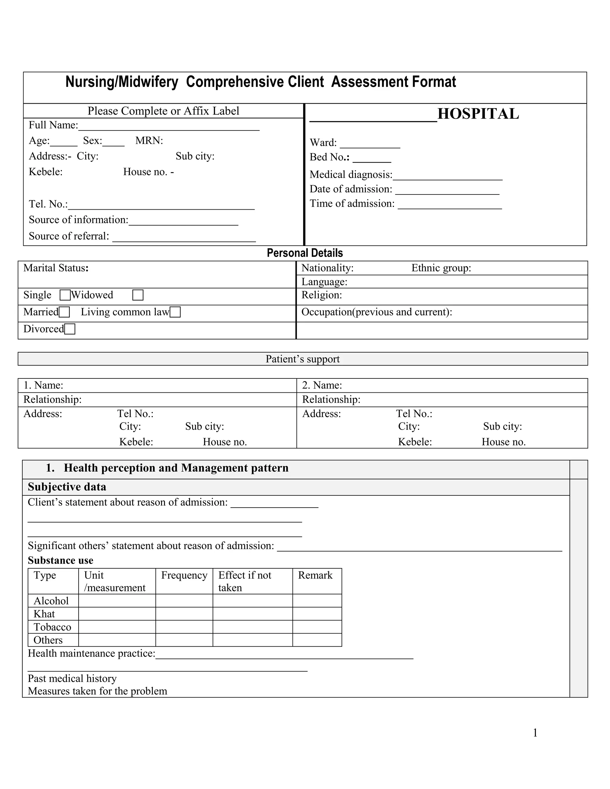 The document provides a comprehensive client assessment format used by nurses and midwives. It collects personal details, health history, physical assessment findings, and social information across 12 sections, including the client's personal and medical history, nutrition, elimination, activity, rest, sexuality, cognitive function, self-perception, coping, roles, values and discharge planning. The assessment is used to identify nursing diagnoses, develop a care plan with goals and interventions, and document progress over time using a subjective, objective, assessment, plan (SOAP) format.
