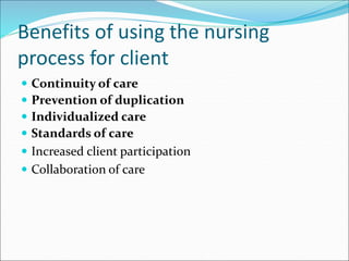 The document discusses the nursing process and its five components: assessment, diagnosis, planning, implementation, and evaluation. It focuses on the assessment and diagnosis components. Assessment involves collecting, validating, organizing, interpreting, and documenting client data from various sources. Diagnosis involves analyzing the assessment data to identify client problems or risks, form nursing diagnoses, and determine appropriate nursing interventions. Nursing diagnoses are clinical judgments that describe a client's response to actual or potential health problems and include a label and related factors.