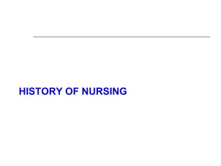 1) The early origins and evolution of nursing from ancient civilizations through major historical events like wars and the establishment of hospitals and codes of sanitation.