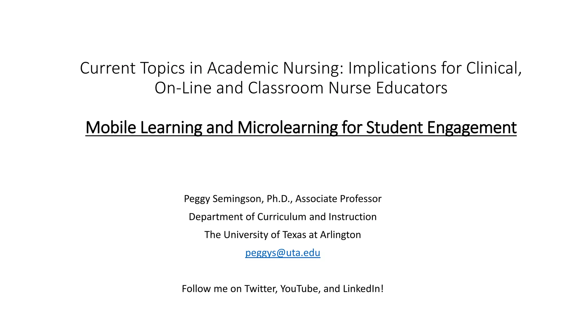 Peggy Semingson discussed mobile learning and microlearning strategies for student engagement. Mobile learning uses portable devices and wireless networks to allow teaching and learning to extend beyond the classroom. Microlearning involves short bursts of information followed by opportunities for interaction. Semingson provided examples of creating short podcasts, videos, and other mobile-friendly content to supplement traditional lectures. She also discussed tools for creating and assessing microlearning content and solicited ideas from participants on how to apply these strategies in their own teaching.