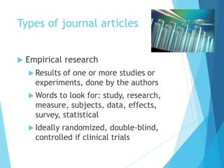 This document discusses different types of nursing journal articles and how to search for them. It describes empirical research articles, review articles, theoretical articles, case studies, and editorials. It also covers Boolean and keyword searching strategies and databases for finding nursing literature, including CINAHL, Cochrane Reviews, and Ovid Nursing Collection. Tips are provided for reading research articles and getting permalinks. Other resources mentioned include the health science library, interlibrary loan, and getting research assistance.