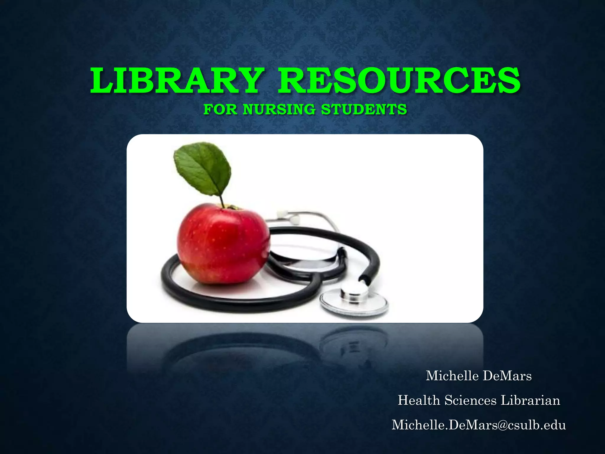 This document provides an overview of library resources for nursing students at CSULB. It reviews how to identify scholarly and scientific literature, use evidence-based practice to guide searches, formulate questions using the PICO(T) format to identify key terms, search databases and limit results, and find additional help through the nursing research guide and librarians. The session aims to help students effectively search for and evaluate information to support their nursing education and practice.