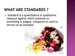 Nursing standards provide a framework for nursing practice and define expectations for nurses. Standards are developed by nursing professionals and reflect best practices. They promote high quality nursing care by establishing guidelines for areas like assessment, diagnosis, care planning, and evaluation. Standards are meant to be objective, achievable and reviewed over time. They are used for various purposes such as evaluating nursing performance, educating nurses, and informing the public about the nursing profession.