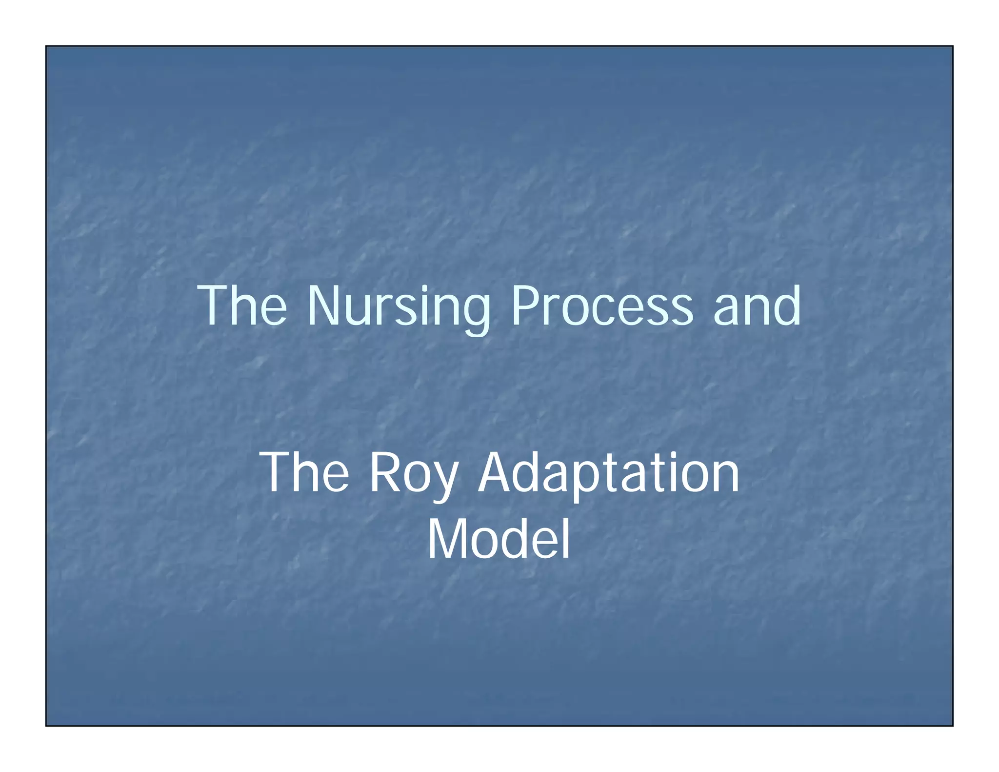 The Roy Adaptation Model is a nursing theory that views individuals as biopsychosocial beings constantly interacting with their environment. It focuses on the promotion of adaptation through four adaptive modes: physiological, self-concept, role function, and interdependence. A nurse uses the nursing process to assess behaviors and stimuli in each of the adaptive modes to determine an individual's adaptation level and promote adaptive responses.