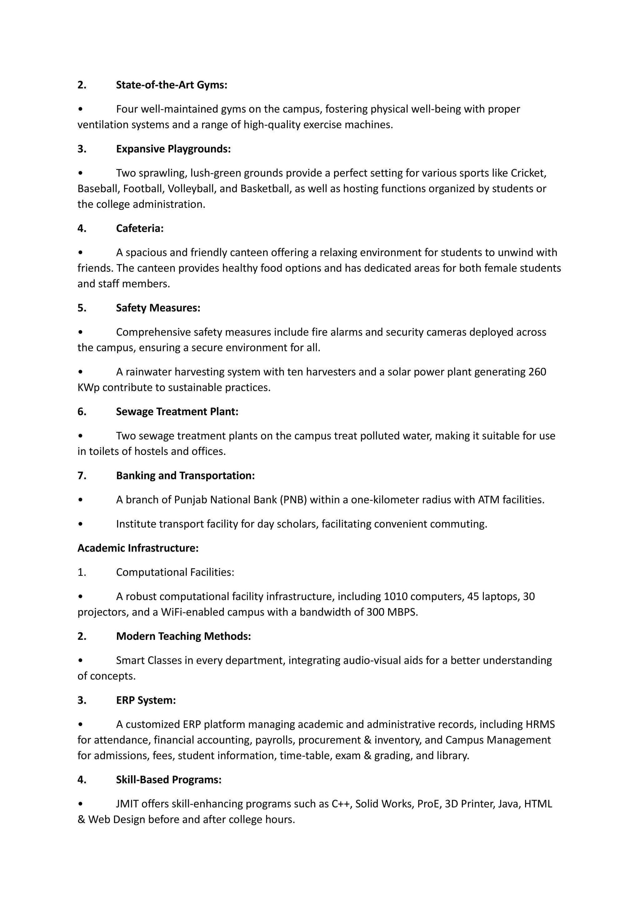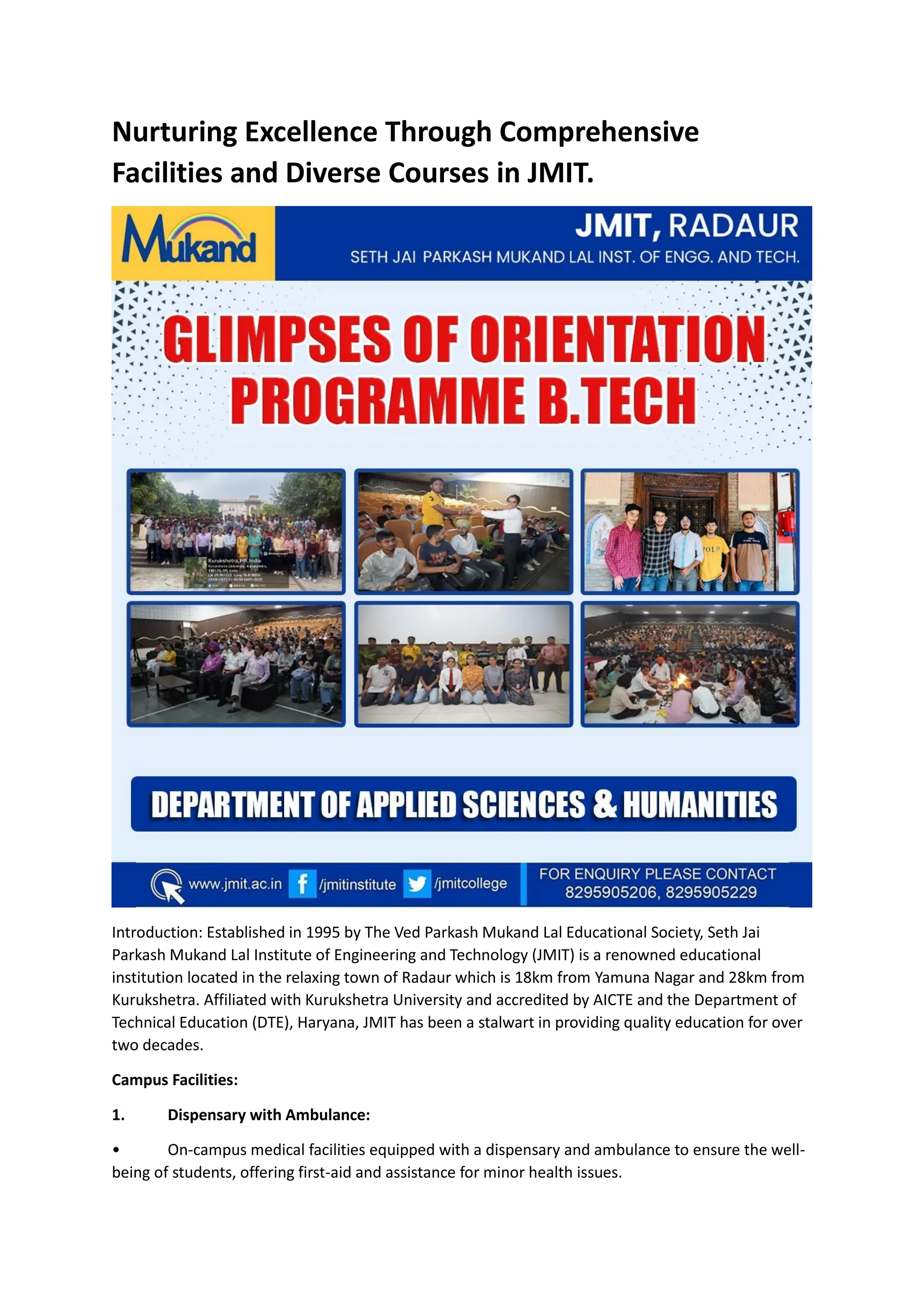 Seth Jai Parkash Mukand Lal Institute of Engineering and Technology (JMIT), established in 1995, offers a diverse range of engineering and management courses with comprehensive facilities aimed at fostering excellence in education. The institution is equipped with state-of-the-art infrastructure, skilled faculty, and a robust placement cell that enhances student readiness for industry demands. JMIT emphasizes practical learning, innovative teaching methods, and student well-being through various amenities, ensuring a holistic educational experience.