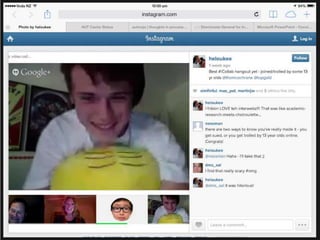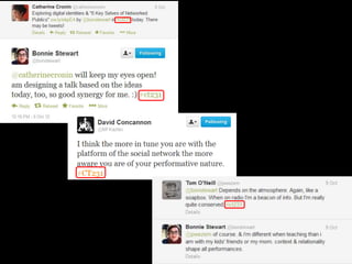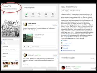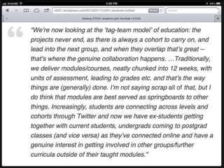 The document discusses the shift in education from centralized instruction to a networked, collaborative approach to learning, emphasizing the importance of active and open engagement. It highlights findings from a meta-analysis supporting active learning over traditional lecturing and the critical need for the higher education sector to adapt to technological innovations. Additionally, it showcases student experiences illustrating how social media can enhance academic communication and knowledge acquisition.