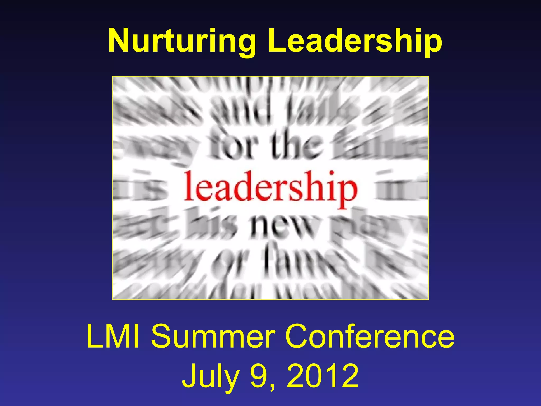 This document discusses nurturing leadership in libraries. It emphasizes flattening organizational hierarchies, empowering employees to act, and nurturing emergent leaders. Emergent leaders are passionate, motivate others, and initiate new ideas. The document suggests nurturing leadership by saying yes to new ideas, encouraging risk-taking and failure, giving creative control and feedback, and modeling good leadership behaviors like calling out issues directly and aligning actions with goals.