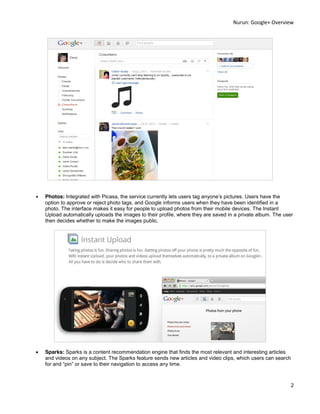 Google+ is a social network launched by Google in June 2011, rapidly growing to 25 million members. It offers features such as profile customization, circles for grouping contacts, and content sharing through a stream, integrating other Google services like Picasa and YouTube. While currently not designed for businesses, Google plans to introduce business profiles and advertising opportunities, aiming to merge search and social functionalities effectively.