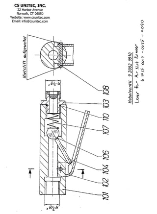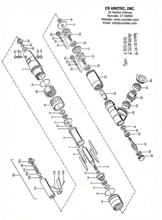 This document is a parts list for a Pneumatic Nut Runner Model 6 1015 0010. It contains 110 parts numbered in sequence, with corresponding item numbers, descriptions, and any relevant part numbers or specifications. The parts list is effective as of August 24, 2005 and is provided by CS Unitec, Inc, located in Norwalk, Connecticut.