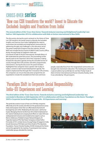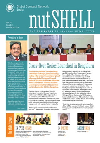 The document summarizes a newsletter published by the Global Compact Network India (GCNI). It discusses the launch of GCNI's new initiative called the "Cross-Over Series" in Bengaluru, India. The series is aimed at promoting networking, knowledge exchange, and policy advocacy around the UN Global Compact principles. It also discusses subsequent events in the series held in other Indian cities on topics like the role of corporate social responsibility in education. The newsletter provides details on the objectives, participants, and key discussions at these events. It also summarizes GCNI's other activities in the period like engaging with academic institutions and launching an Asia-Pacific resource center on responsible business practices.