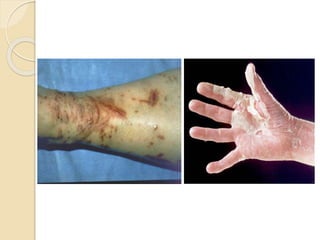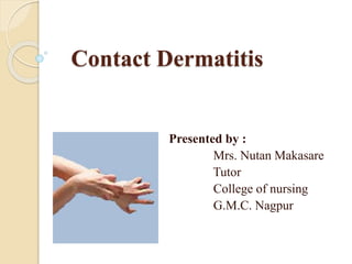 This document provides an overview of contact dermatitis. It defines contact dermatitis as an inflammatory skin reaction to physical, chemical, or biological agents. Common causes include soaps, detergents, chemicals, plants, jewelry, and work-related materials. Clinical manifestations include itching, burning, edema, papules, vesicles, oozing, redness, crusting, drying, cracking, scaling, bleeding, blistering, peeling, and secondary bacterial infection. Medical management involves bland lotions, cool wet dressings, corticosteroid ointments and baths, and systemic corticosteroids for severe cases. Nursing management includes taking a history, examination, providing medication, patient education, and