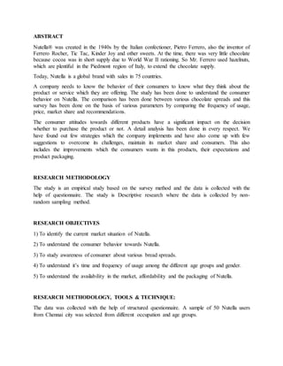 The document is a study on consumer perception of Nutella, exploring consumer behavior, preferences, and awareness regarding the chocolate spread. It highlights Nutella's market position, competitive landscape, and suggestions for improvements in flavors, distribution, and packaging based on survey data collected from 50 users in Chennai. Findings indicate widespread satisfaction among consumers, although there are concerns about pricing, availability, and product diversity.