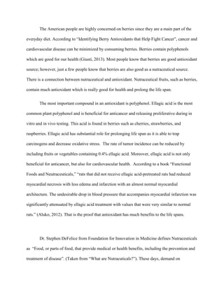 Berries contain antioxidants like polyphenols that are beneficial for health and prolonging lifespan. Ellagic acid, found in berries like cherries, strawberries, and raspberries, plays a key role in prolonging lifespan by trapping carcinogens and reducing oxidative stress. Cherries are a particularly rich source of antioxidants that can reduce the risk of cardiovascular disease, inflammation, diabetes, and cancer. Strawberries and raspberries also contain antioxidants that can lower oxidative damage and help maintain blood pressure and glucose levels. In conclusion, consuming berries regularly provides antioxidants that support anticancer effects, anti-inflammation, cardiovascular health, and longevity.
