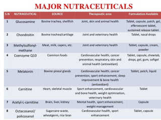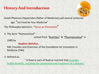 This document discusses nutraceuticals, which are foods or nutrients that provide health benefits. It defines nutraceuticals as foods or food components that can prevent or treat disease. The document outlines several advantages of nutraceuticals, such as improving health, delaying aging, and having fewer side effects than pharmaceuticals. It provides examples of conditions that nutraceuticals can help, such as arthritis, cancer prevention, cholesterol lowering, and diabetes. Finally, the document lists several therapeutic applications of nutraceuticals in treating illnesses and disorders like sleeping problems, digestion issues, certain cancers, osteoporosis, and blood pressure issues.