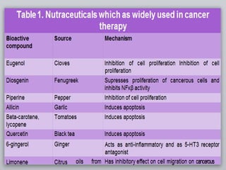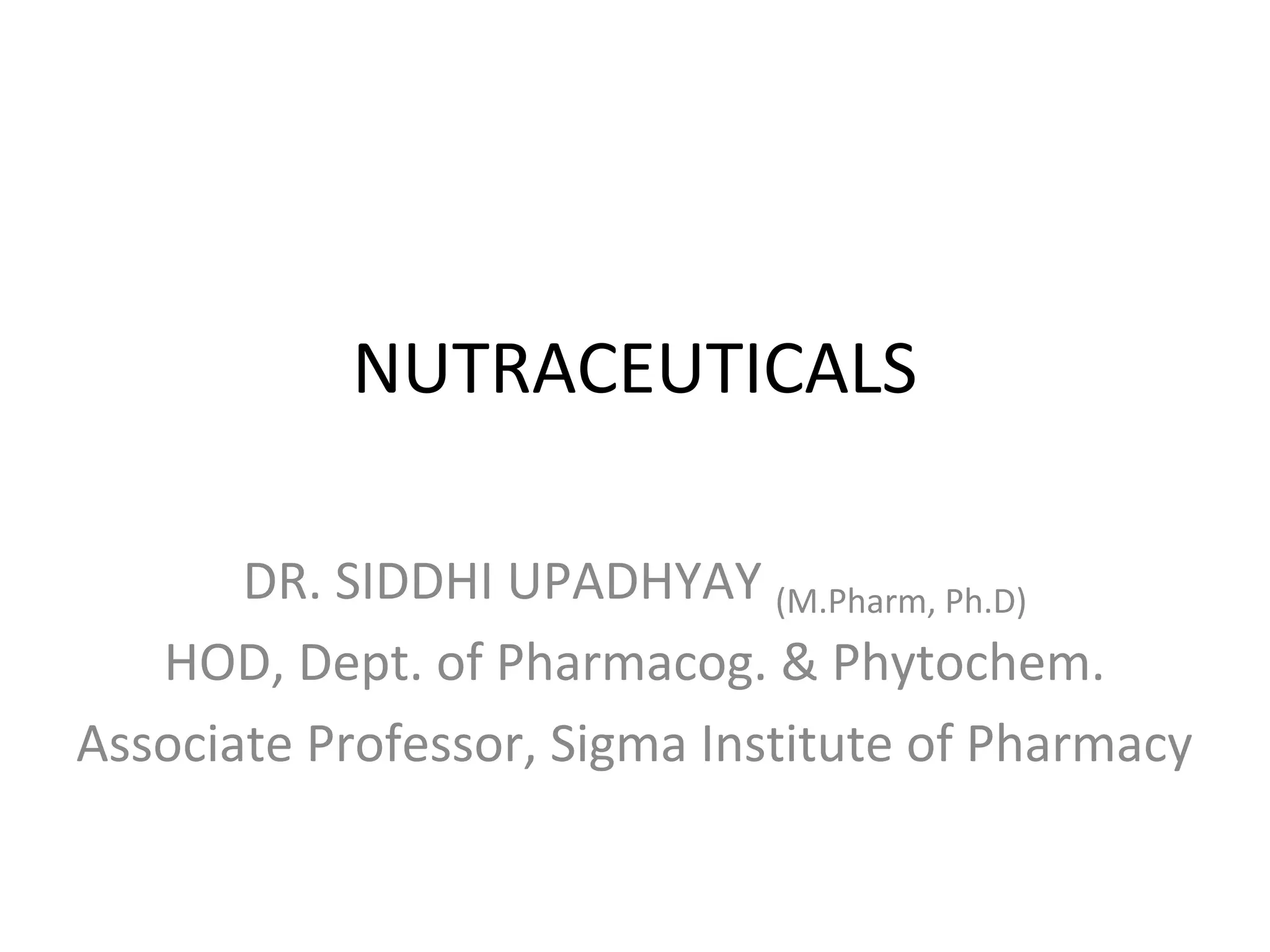 This document provides an overview of nutraceuticals. It defines nutraceuticals as foods or food components that provide health benefits for preventing or treating disease. Key points include: