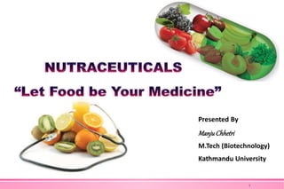 The document provides an overview of nutraceuticals. It defines nutraceuticals as food or food components that provide health benefits, including the prevention and treatment of disease. Nutraceuticals are classified into nutrients, herbals/phytochemicals, and dietary supplements. Common examples of disease areas that nutraceuticals can benefit include joint health, cardiovascular health, eye health, and cancer prevention. The global nutraceutical market is growing and includes functional foods, functional beverages, and dietary supplements. Some popular marketed nutraceutical products are also mentioned.