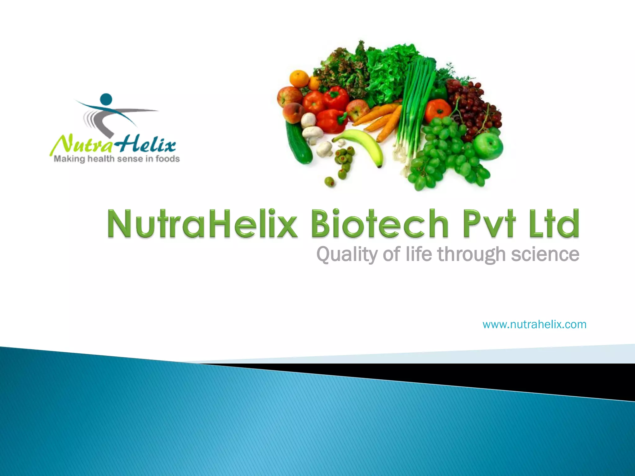 Nutrahelix Biotech Pvt Ltd aims to enhance quality of life through health-focused products in nutrition, functional foods, and nutraceuticals. The company focuses on translating research in food and nutrition into practical products while ensuring scientific validation, safety, and efficacy. Their capabilities encompass various scientific fields and they maintain partnerships for research and development, targeting innovative health solutions.
