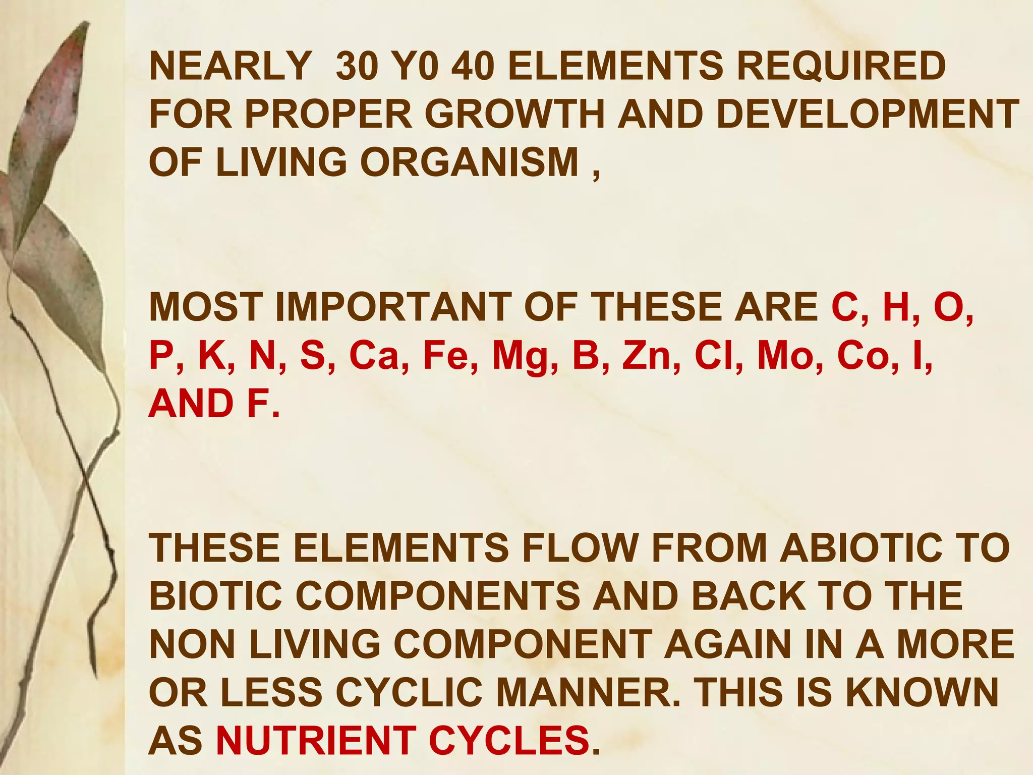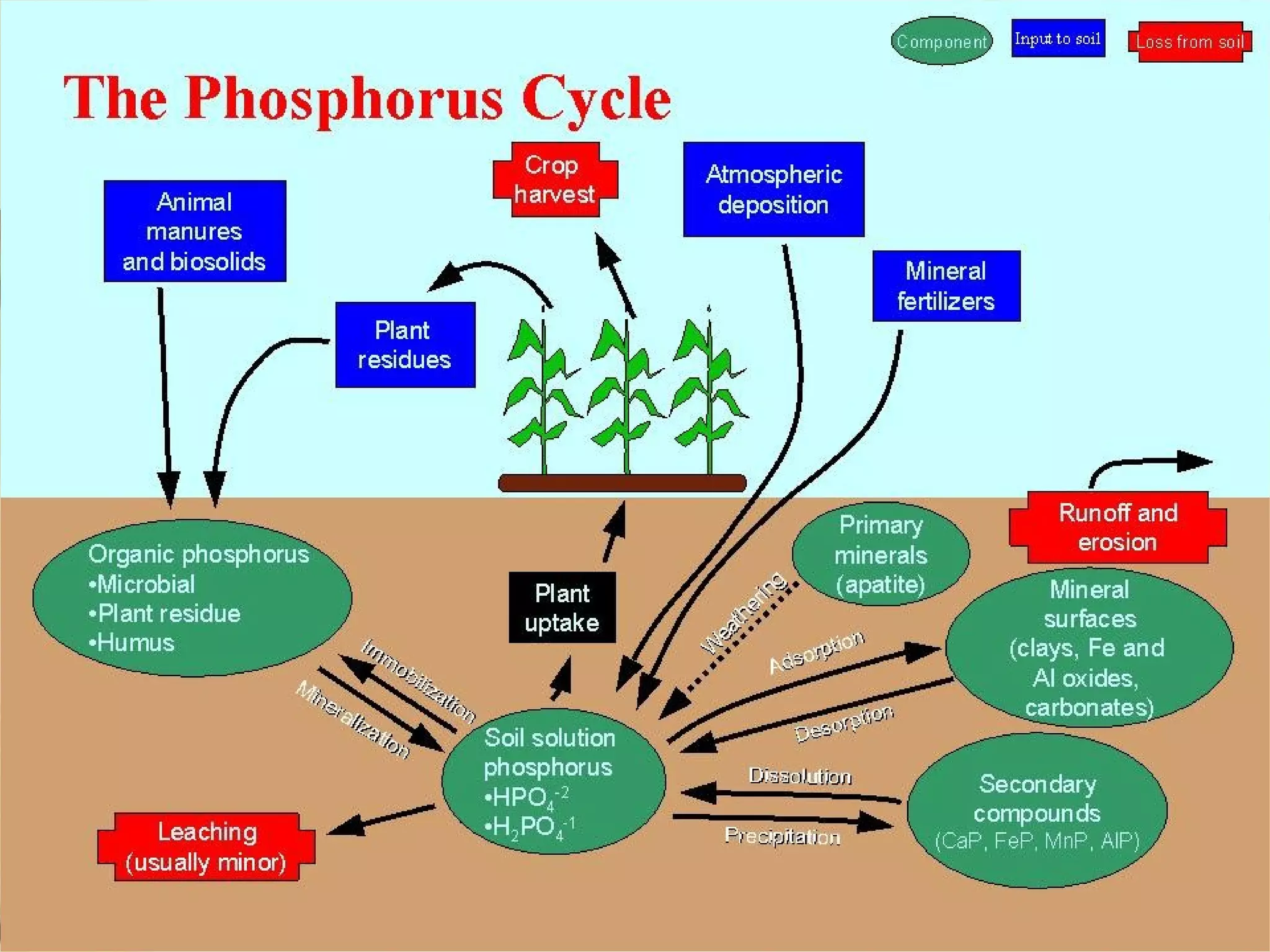 There are three main biogeochemical cycles - the hydrologic, gaseous, and sedimentary cycles. The sedimentary cycle involves mineral elements being obtained initially from inorganic sources in the soil and occurring as dissolved salts. The phosphorus cycle begins with phosphorus contained in sedimentary rocks in the form of apatite, which weathers into the soil where plants uptake it. Phosphorus then moves through the food chain and sometimes aquatic systems before settling in sediments or being lost to leaching. The sulfur cycle involves sulfur being found in rocks underground and ocean sediments, moving between organic and inorganic forms through microbial processes, and cycling through the lithosphere, hydrosphere and biosphere.