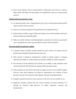 2) There are two main types of nutrient cycles - gaseous cycles like carbon and nitrogen that occur globally in the atmosphere, and sedimentary cycles like phosphorus that tend to accumulate in sediments.