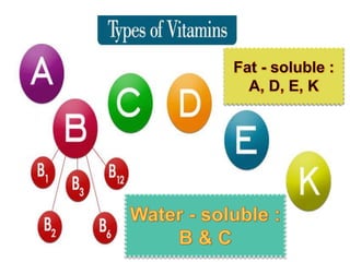 The document discusses the six major types of nutrients needed by the body: carbohydrates, fats, proteins, vitamins, minerals, and water. Carbohydrates and fats provide energy, while proteins aid in growth, building muscles and tissues, and providing energy. Vitamins and minerals regulate body functions. The document also describes simple experiments students can do to test foods for the presence of carbohydrates, fats, and proteins.